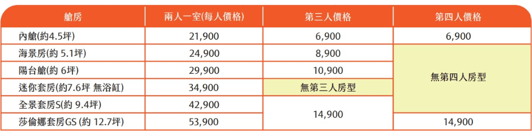 | 預訂2026指定行程,享同艙房第3人免費! 12/31前不限艙等限時優惠(指定航次:03/28、04/06、04/13) |