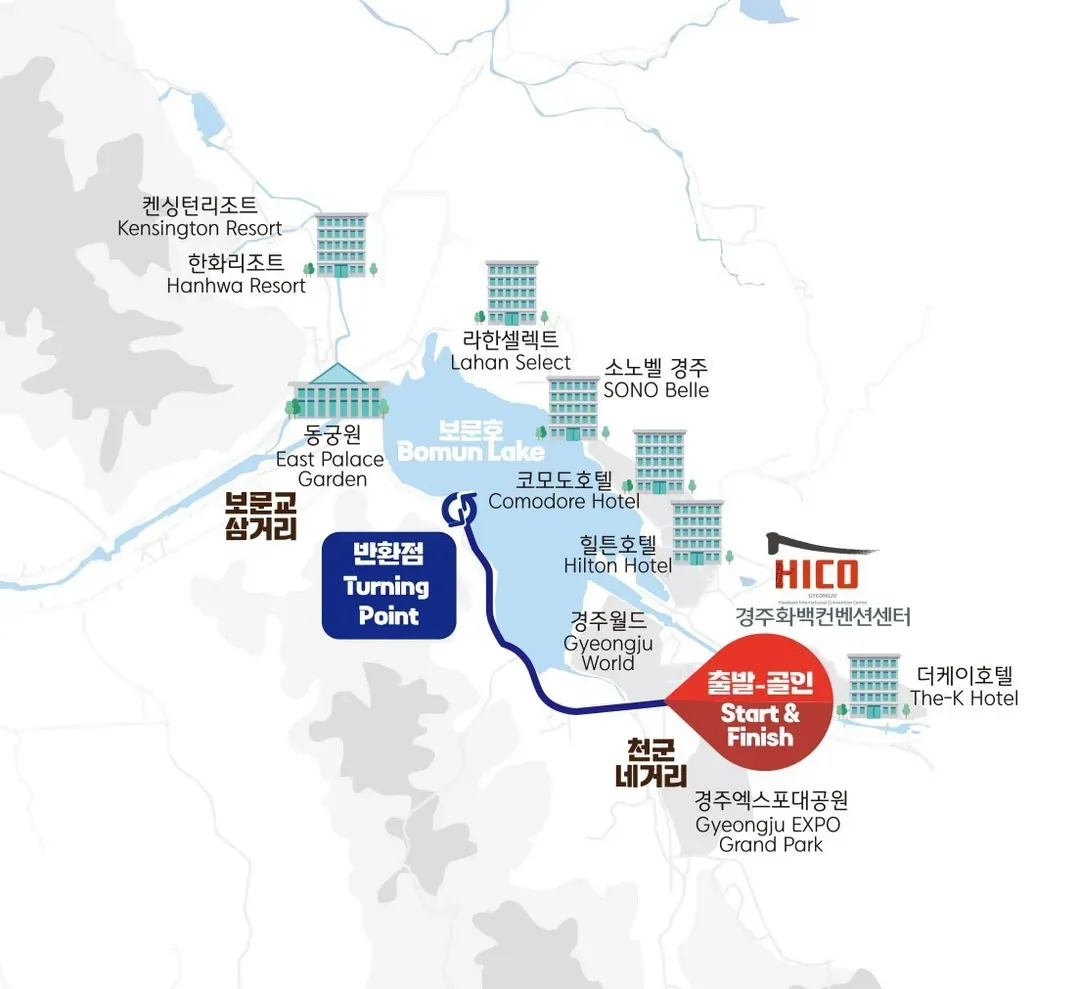 富德洞行政福利中心前(出發) → 往慶州世界方向右轉(返回) → 天雲十字路口 → 名家咖啡店前 → 普門三岔口 → 韓華度假村前 → 羅韓酒店 → 康莫多酒店 →希爾頓飯店十字路口→青雲十字路口 → 富德洞行政福利中心(Goalin)
