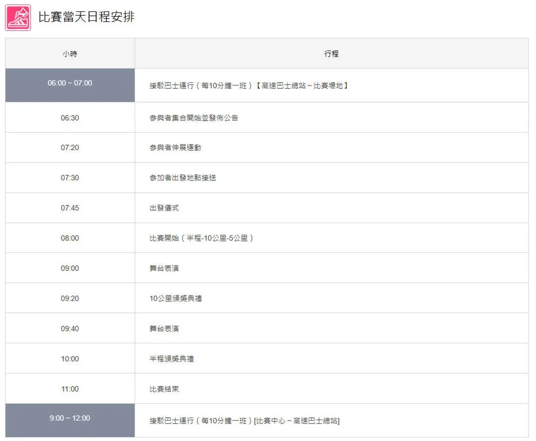 • 賽事限制時間:半馬2小時30分,10K&5K均為1小時30分