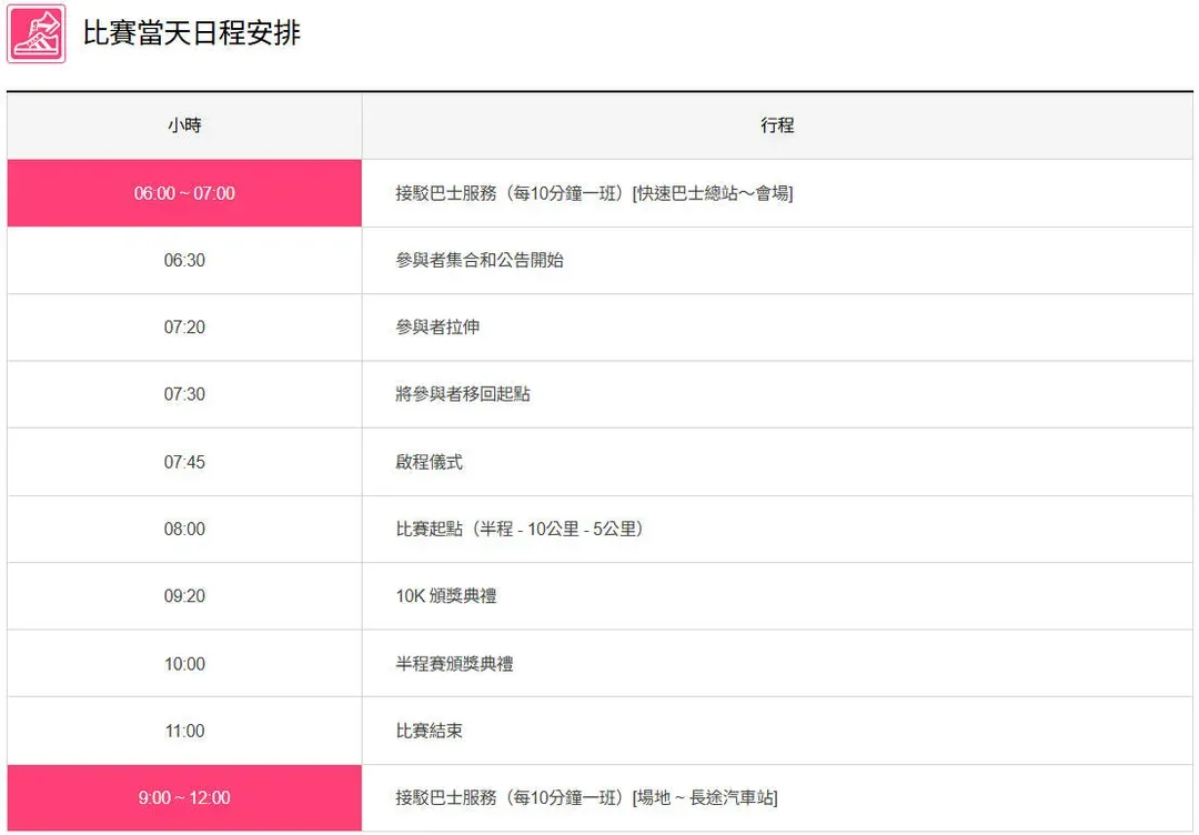 - 賽事限制時間:半馬2小時30分,10K&5K均為1小時30分
