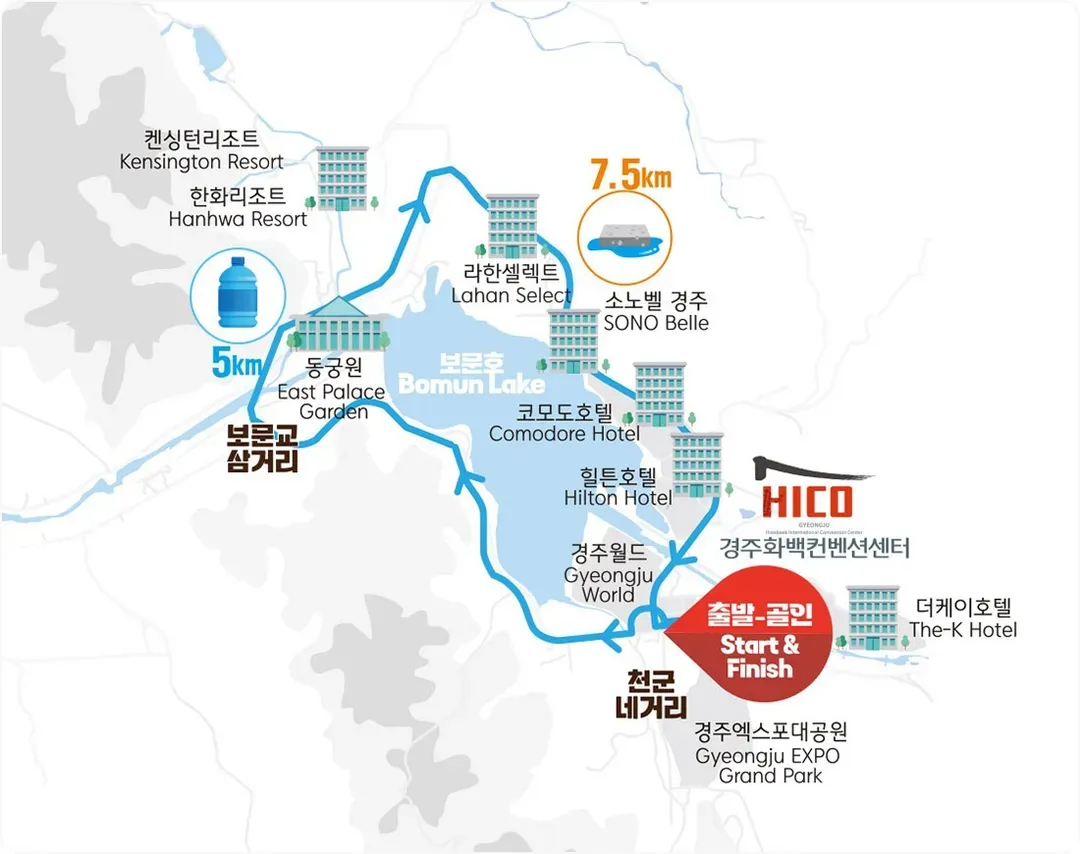 富德洞行政福利中心前(出發) → 往慶州世界方向右轉(返回) → 天雲十字路口 → 名家咖啡店前 → 普門三岔口 → 韓華度假村前 → 羅韓酒店 → 康莫多酒店 →希爾頓飯店十字路口→青雲十字路口 → 富德洞行政福利中心(Goalin)