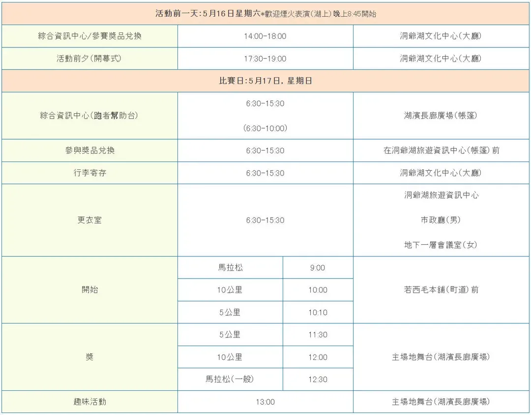 | 2026洞爺湖馬拉松 | 全馬(42.195公里)、10K | 2025/05/17 (日) | 〔全馬〕9:00 AM〔10K〕10:00AM (※日本時間) | 參賽權+2晚住宿 |