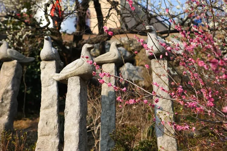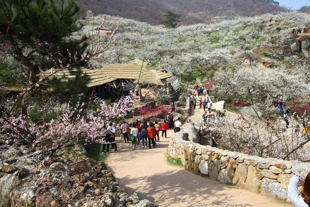 沿著智異山腳下的蟾津江前行,便可抵達蟾津村,這裡的梅樹隨處可見,每年3月,梅花如白雪般綻放,壯觀又純淨。村民以梅樹代替作物,這裡的氣候適宜梅果生長,每年收成超過100噸。梅花村的梅花在3月初綻放,與智異山的殘雪相映成趣,並成為光陽梅花節的亮點。