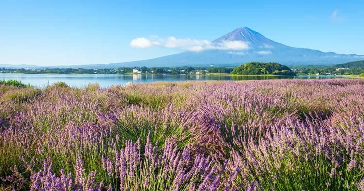 一大片花園緊鄰河口湖,天氣好時能看到富士山和花海同框。