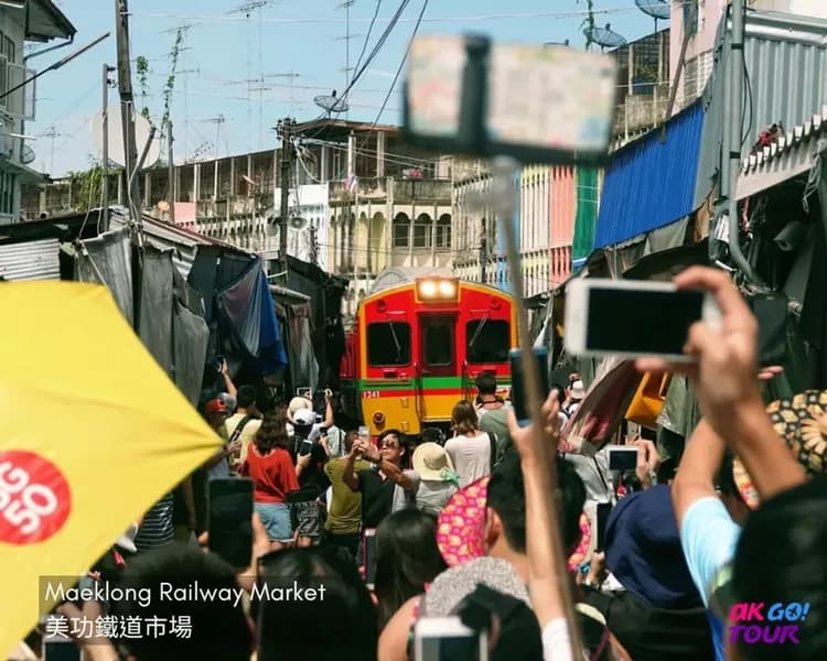 鐵道市場位於泰國 Maeklong Station 車站旁,是泰國少數建在鐵軌上的傳統市場。在這裡,你可以親眼見證攤販如何隨著火車進出,迅速收放攤位,展現獨特的在地生活方式,絕對是不可錯過的奇景!