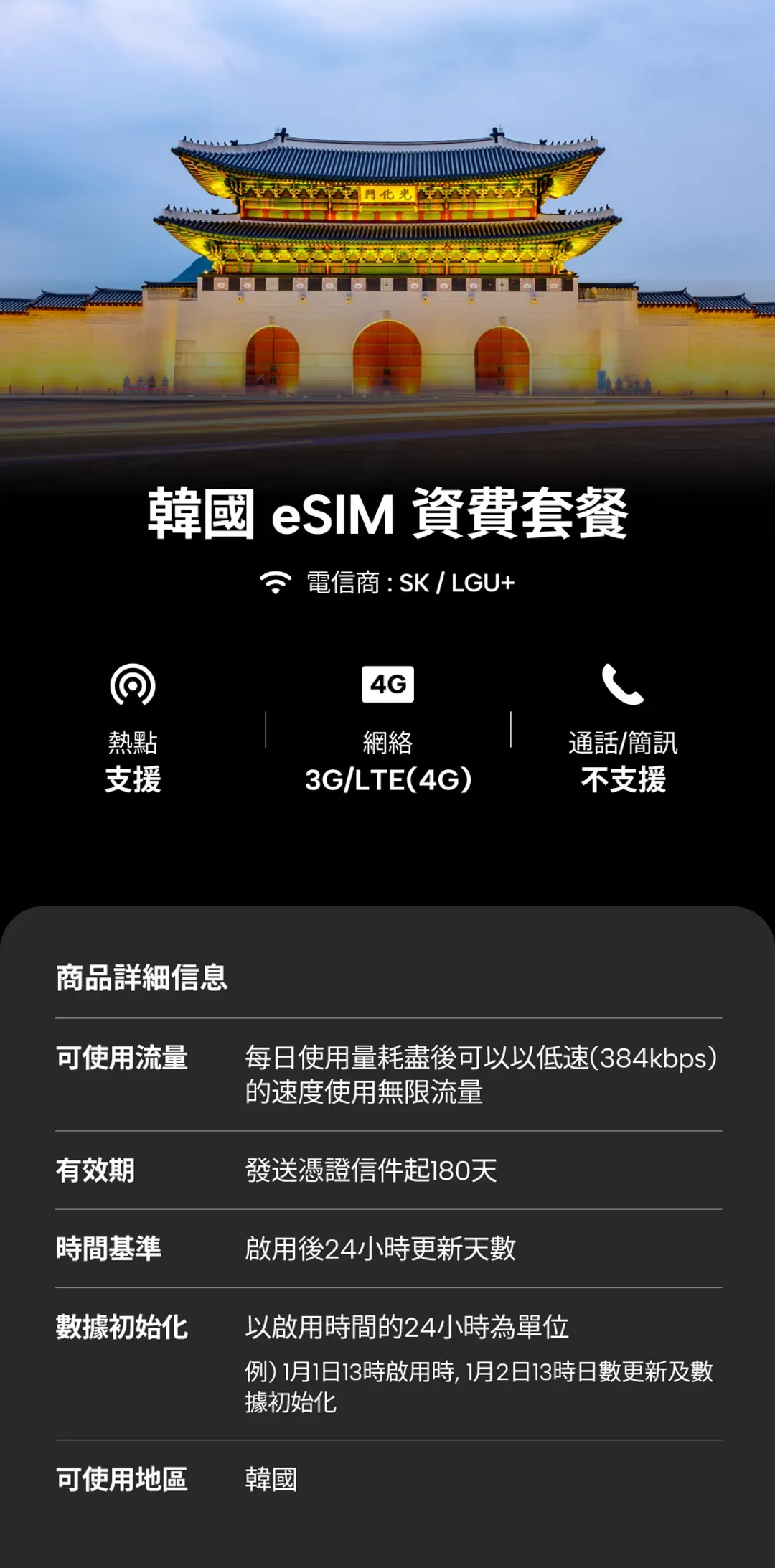 3. 【韓國 eSIM】每日型 (500MB/1GB/3GB)|SK / LGU+ 雙電信漫遊網卡