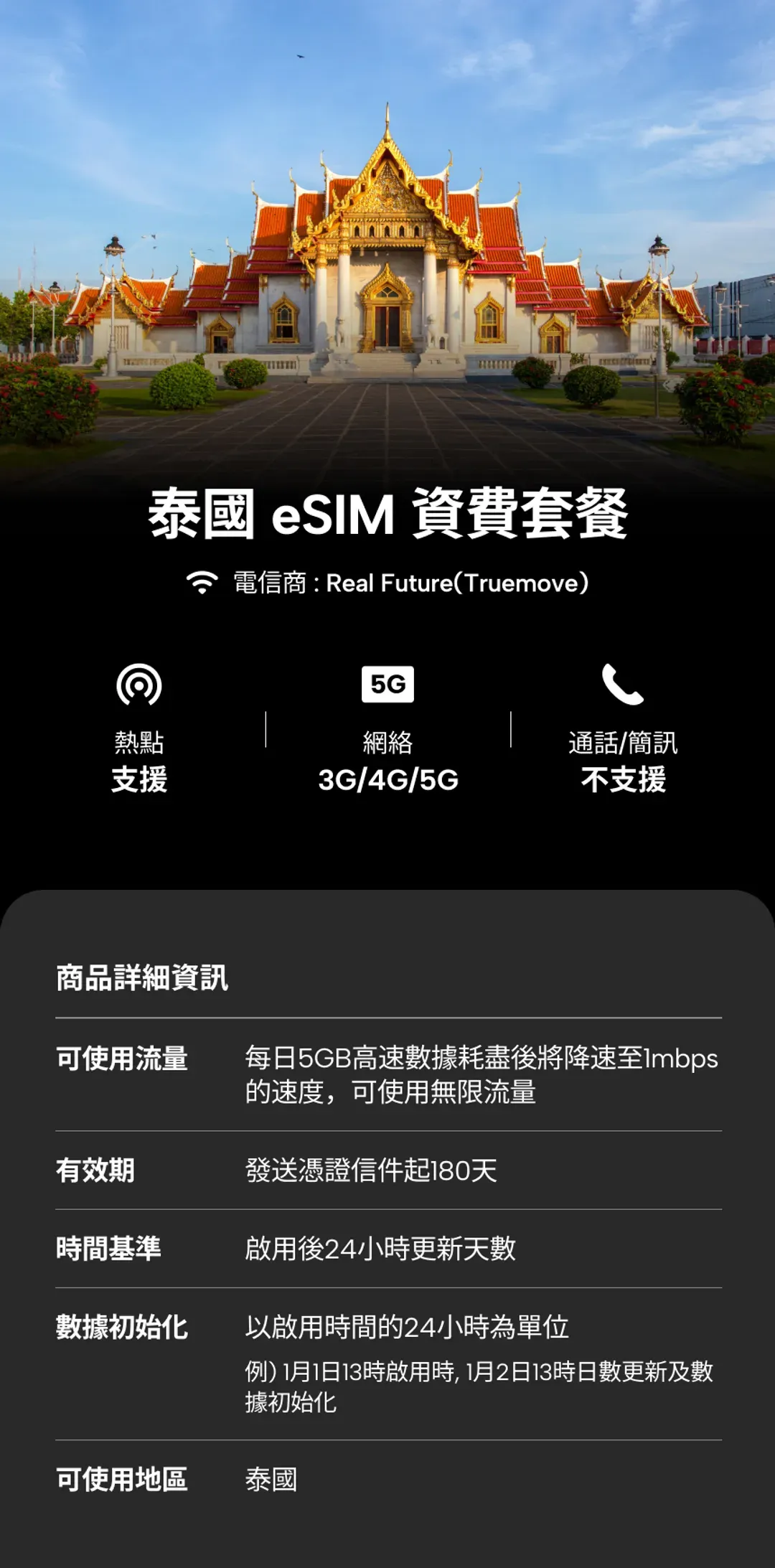 - eSIM可預先安裝,但未抵達旅遊地前請勿開啟「數據漫遊」功能,否則會開始計算流量。