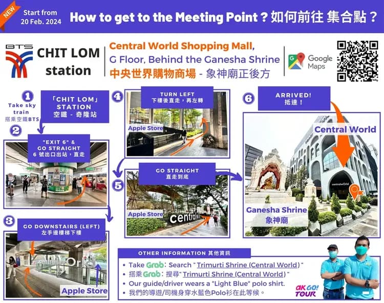 1. (建議)搭乘空鐵:請至「BTS - Chit Lom」站下車 —> 6 號出口 —> 直行前往「中央世界購物商場」(Central World) —> Apple Store 旁手扶梯下至平面道 —> 左轉後,直走即可抵達。
