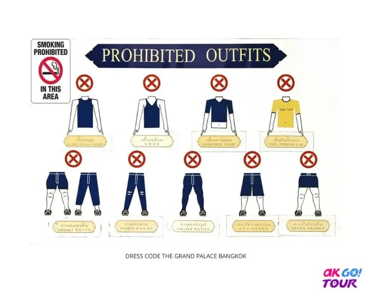 大皇宮與玉佛寺對服裝有嚴格規定,詳見下圖。若您的服裝不符合要求,可在入口處支付 300 泰銖押金租借沙龍,以符合參觀標準。