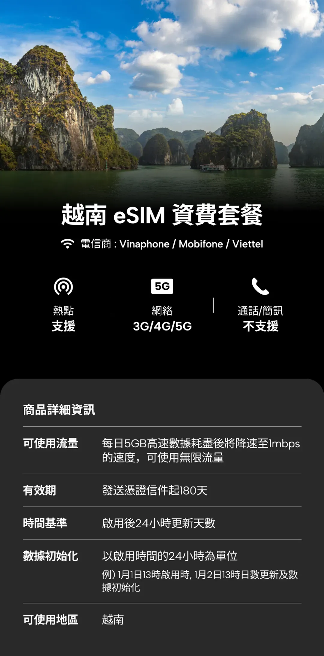 - eSIM可預先安裝,但未抵達旅遊地前請勿開啟「數據漫遊」功能,否則會開始計算流量。