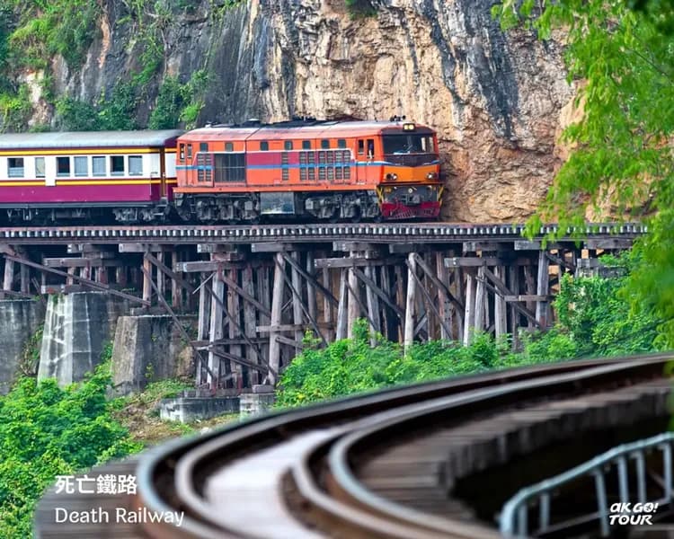 搭乘火車,穿越死亡鐵路最壯麗精華路段——列車沿著險峻山壁前行,一側是峭壁,另一側則是蜿蜒的桂河。這條棧道,皆由當年無數戰俘以人力一鏟鏟挖鑿而成,見證歷史的滄桑與悲壯。
