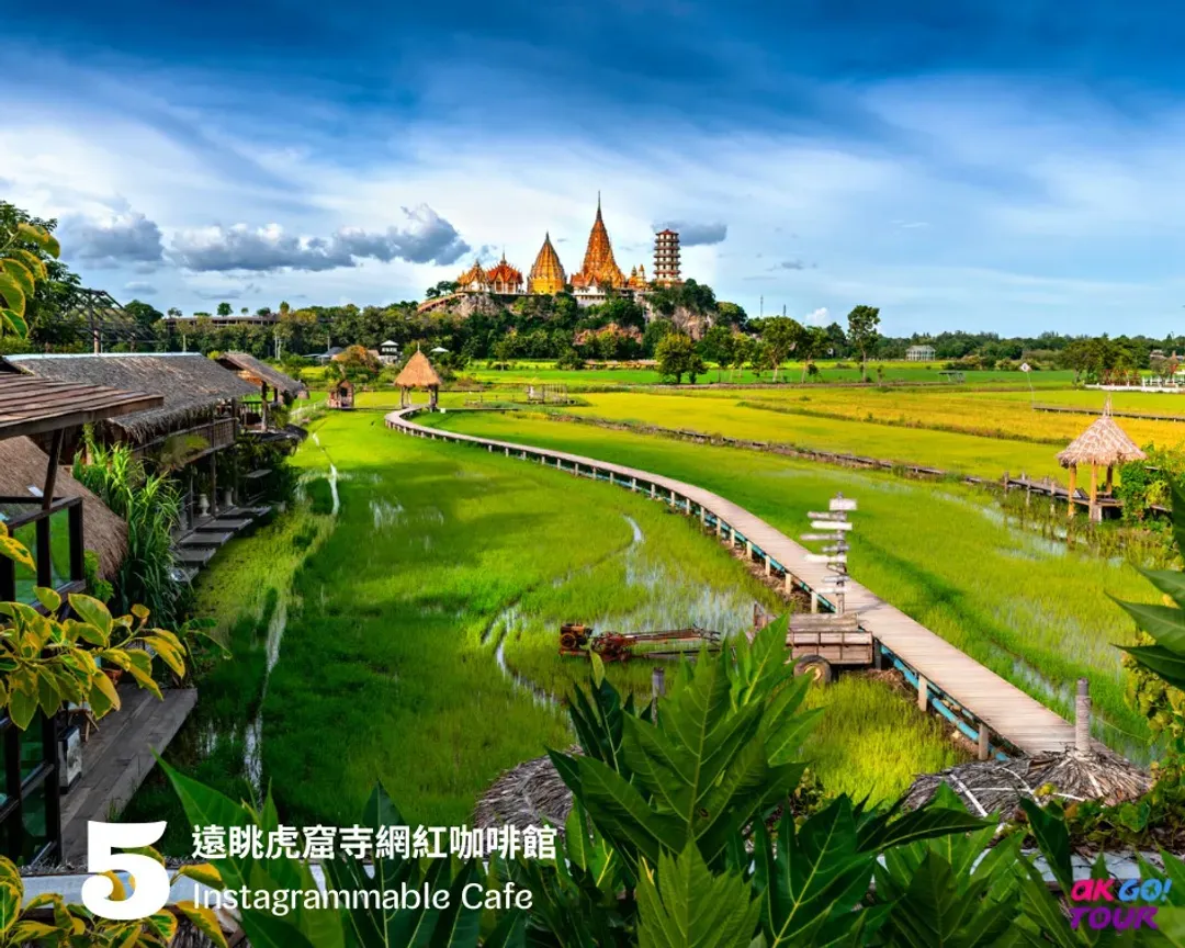 這家咖啡館坐落於北碧鄉間,位於虎窟寺(Wat Tham Sua)山腳下的廣闊田野中央。農忙時節,稻田一片翠綠,收割後則化為金黃大地,景色詩意盎然。開闊的視野讓人心曠神怡,也成為泰國近來備受追捧的打卡熱點。