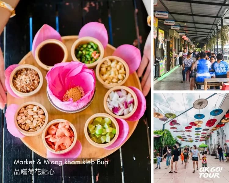 行程中特別贈送一道泰式傳統點心——荷花面康(Miang Kham Kleb Bua),這道小吃起源於泰國皇室宮廷,以椰絲、蝦米、花生、香草、棕櫚糖等天然食材為餡,包裹在新鮮蓮花葉中食用,色彩繽紛、口感豐富,既美觀又美味。