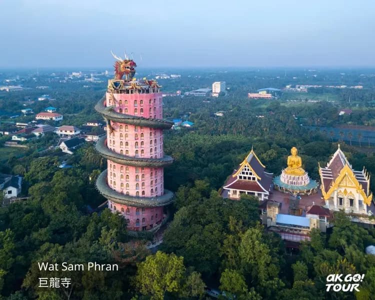 泰國的Wat Sam Phran巨龍寺,也被稱為「龍廟」或「龍緣寺」,它最著名的是一座17層高的粉紅色塔樓,塔樓外面盤繞著一條巨大的龍,從地面蜿蜒而上,直到塔頂。