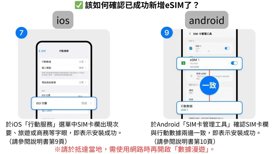 - eSIM可預先安裝,但未抵達旅遊地前請勿開啟「數據漫遊」功能,否則會開始計算流量。