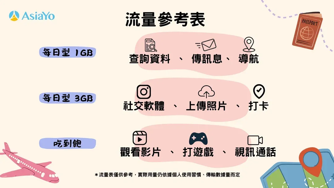 - 吃到飽(重度使用): 適合觀看影片、玩遊戲、視訊通話。 註:以上僅供參考,實際用量仍依個人使用習慣與傳輸數據量而定。點擊優惠購買「AsiaYo 全球 eSIM」。