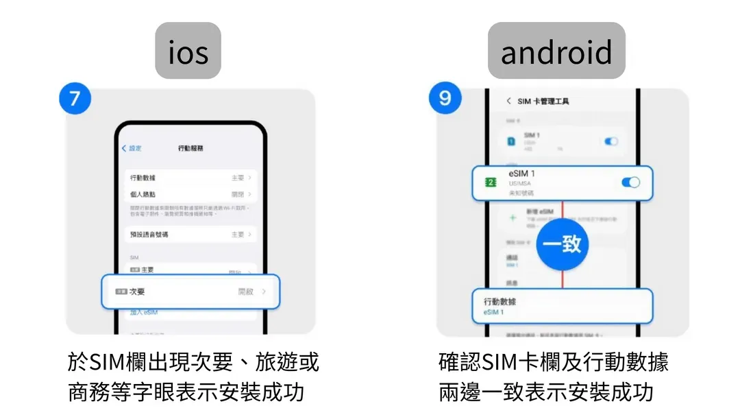 - 行動數據設定: 確認手機的「行動數據」來源已切換為該 eSIM,而非原本的台灣門號。
