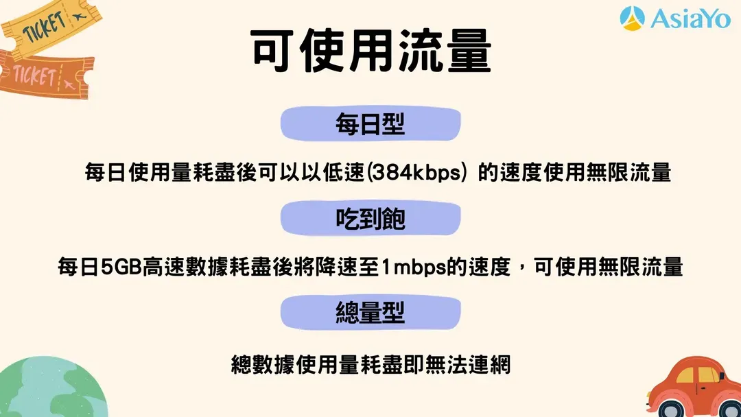 可依據以下AsiaYo 匯總的不同類型的網卡流量用盡後的狀況,再結合自身需求購買: