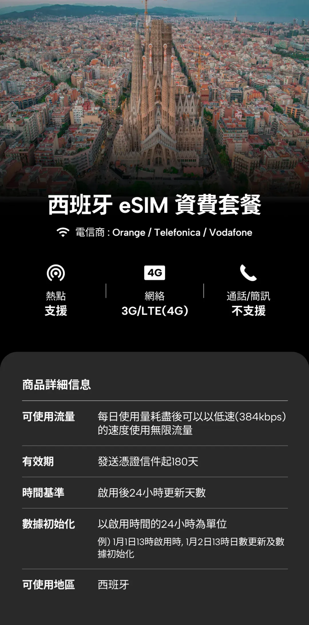 | 總量型 | 固定總流量,用完即斷網 | ⭕ | 📶 電信: Orange / Telefonica / Vodafone 📅 效期: 憑證發送後 180 天 |