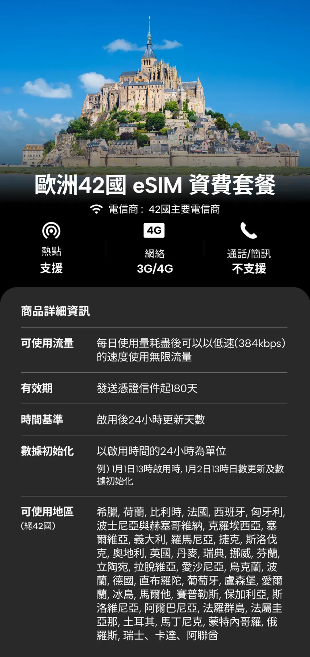 小提醒:歐洲許多飯店/咖啡廳Wi-Fi穩定,可以多加利用。但「吃到飽」方案通常有「公平使用原則」(FUP),例如每天高速流量達標後會降速,購買時請務必看清楚說明喔!