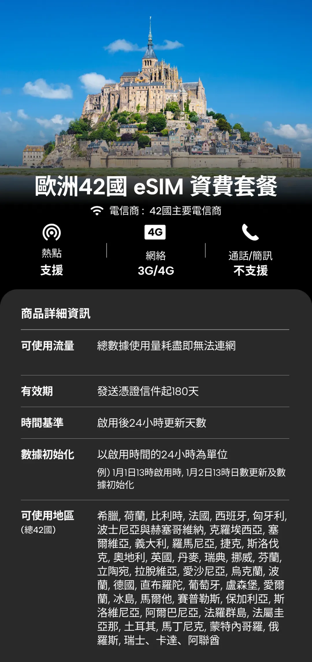 - eSIM可預先安裝,但未抵達旅遊地前請勿開啟「數據漫遊」功能,否則會開始計算流量。
