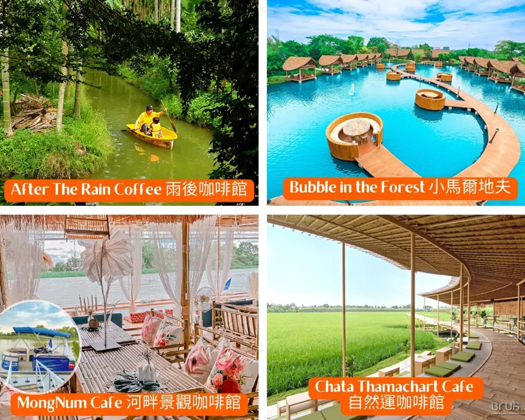 四間選一間:1. 小馬爾地夫 Bubble in the Forest Cafe、2. 可以在椰林裡划小船 After The Rain coffee、3. 最自然系 Chata Thamachart Cafe、4. 必須搭專屬渡船才能到,很浪漫 Mong Num Cafe