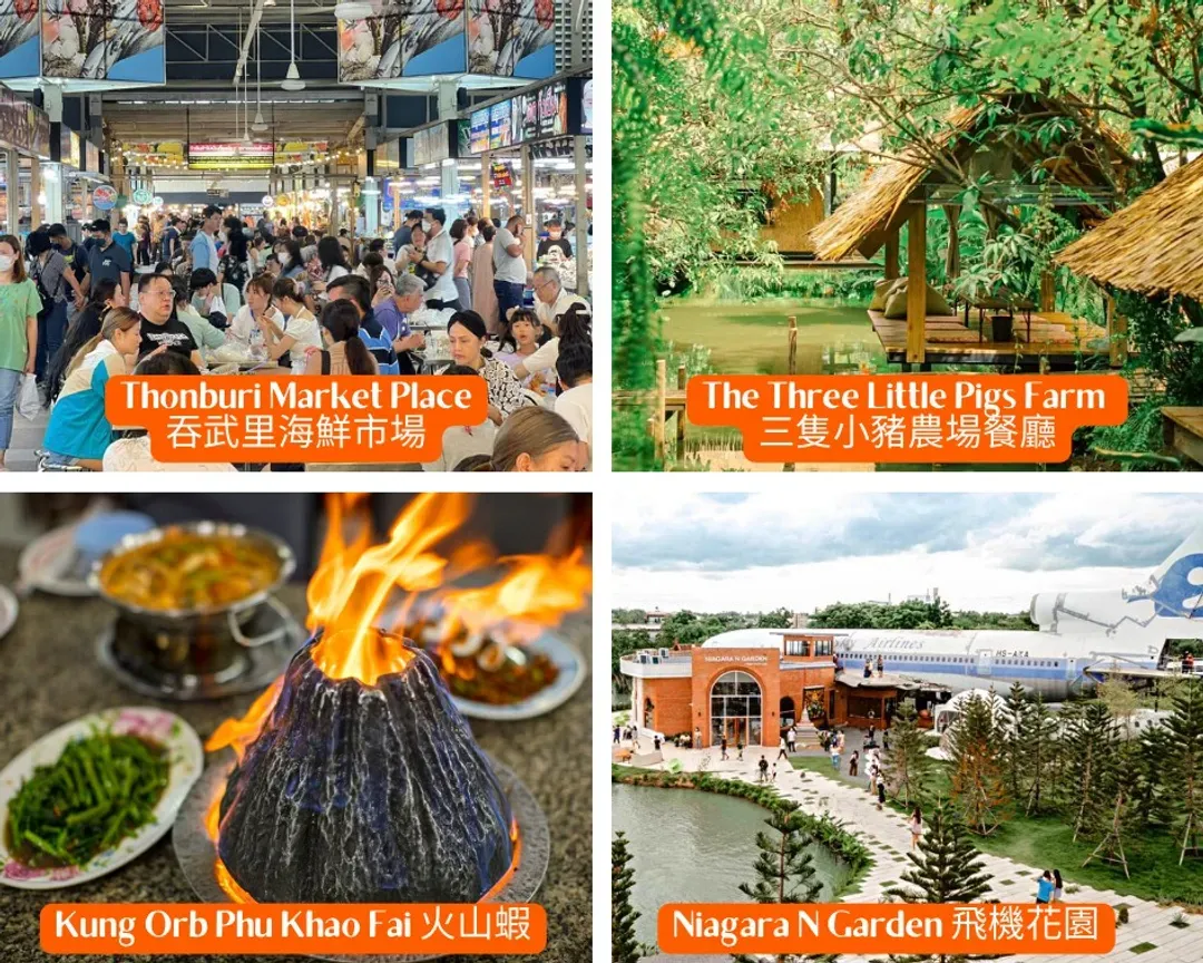 四個地點擇一享用您的晚餐:1. 747飛機餐廳 Niagara N Garden、2. 悠靜講求原生態 The Three Little Pigs Farm、3. 火山蝦創始店 Kung Orb Phu Khao Fai、4. 海鮮現點現做 Thonburi Market Place