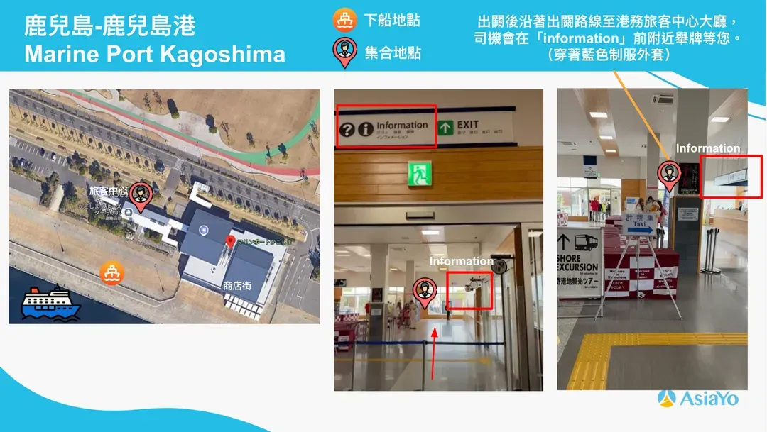 - 鹿兒島海洋港(港務旅客中心大廳-「information」前),司機會穿著藍色制服外套舉牌等您。請參考下圖。