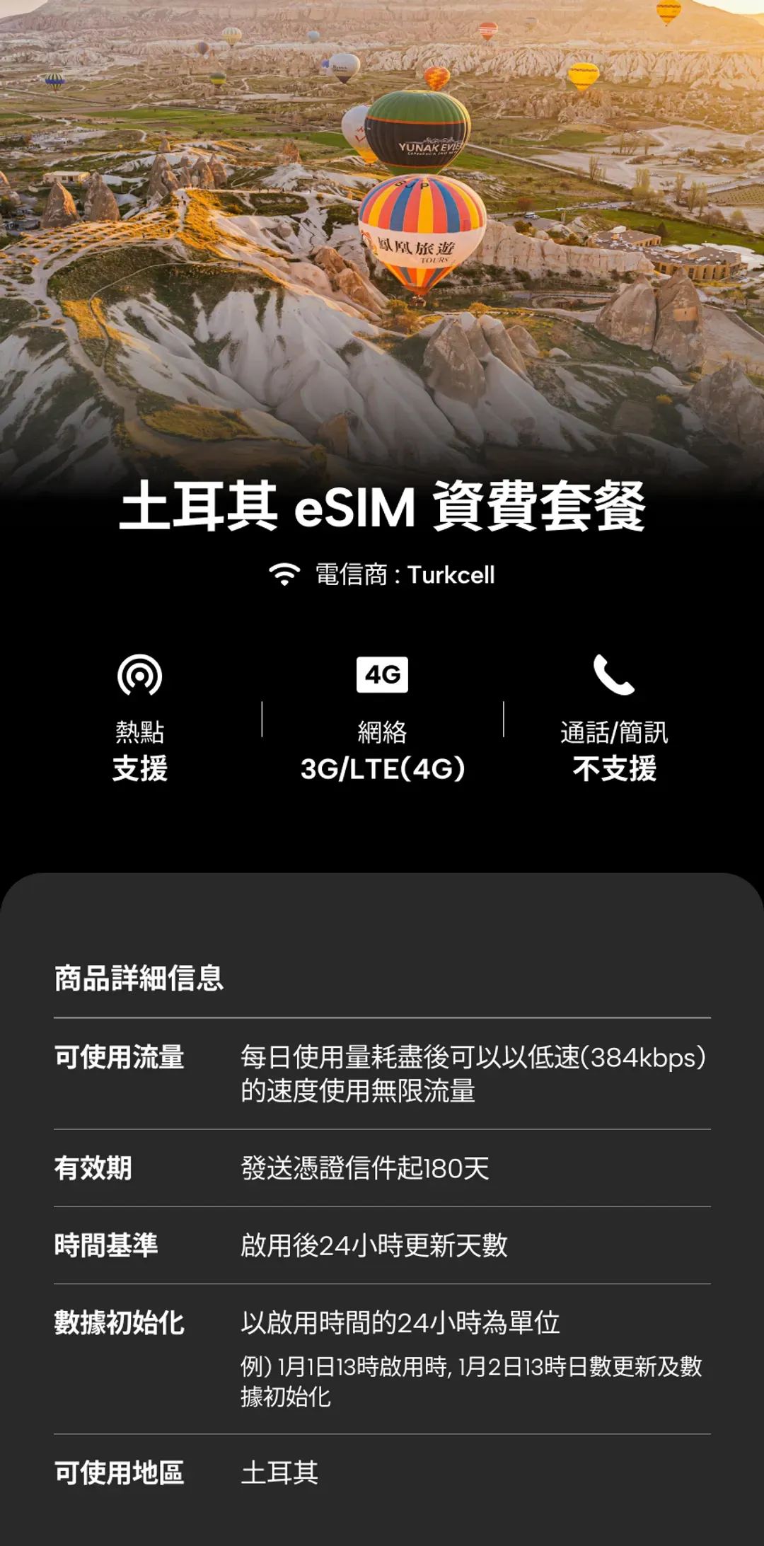 - 本卡實際訊號及連線速度會受地區、地形、氣候、建物遮蔽、使用人數、網路系統或終端設備等因素影響而有所差異,如當地或手機無法支援 4G 網路時,將自動轉為 3G 訊號。 此外,設備所支援的頻段不同,網速也會有所不同,恕無法因少數地區之訊號狀況而要求退費。另因地震、颱風等不可抗力事件致使網路不穩、斷訊或無法使用等情形,亦不得要求退換貨。