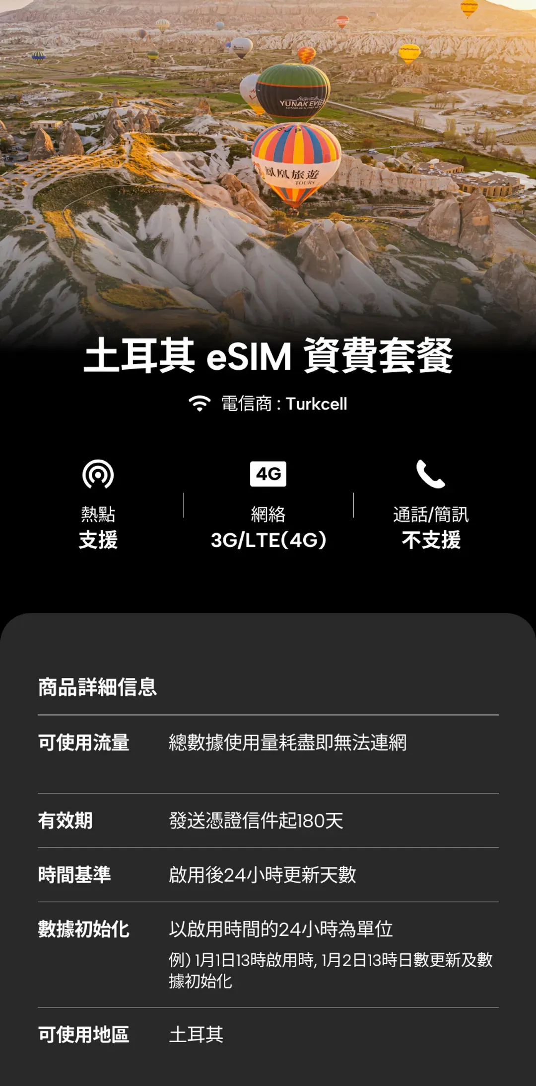 - 本卡實際訊號及連線速度會受地區、地形、氣候、建物遮蔽、使用人數、網路系統或終端設備等因素影響而有所差異,如當地或手機無法支援 4G 網路時,將自動轉為 3G 訊號。 此外,設備所支援的頻段不同,網速也會有所不同,恕無法因少數地區之訊號狀況而要求退費。另因地震、颱風等不可抗力事件致使網路不穩、斷訊或無法使用等情形,亦不得要求退換貨。