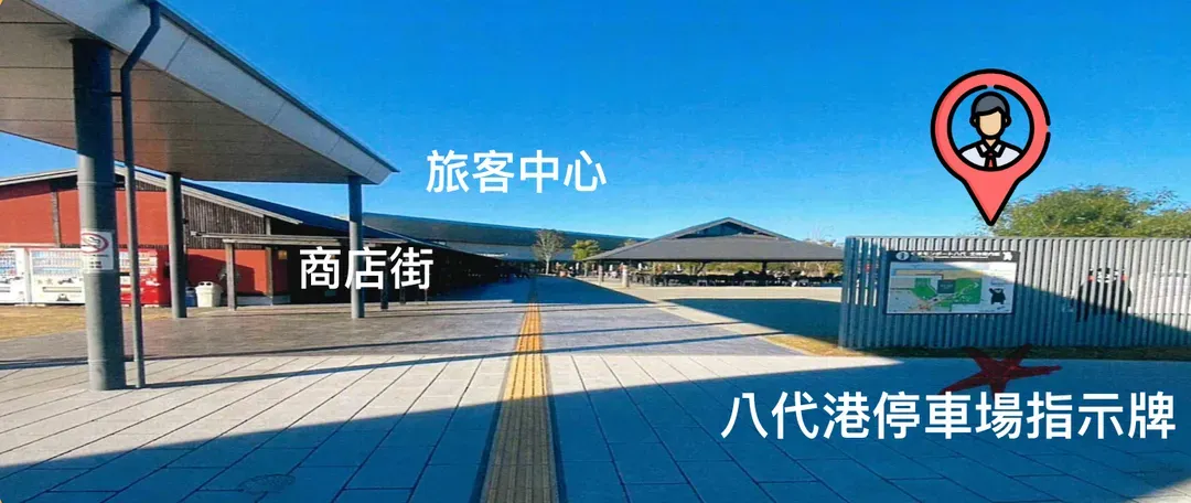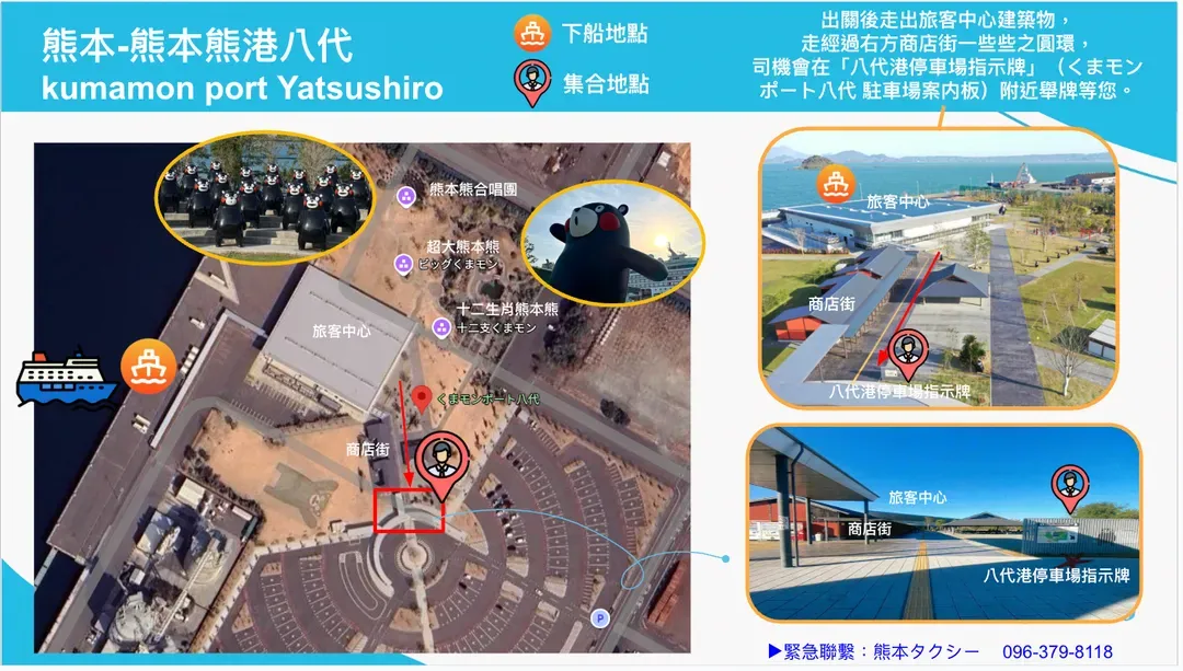 3. 集合地點為“熊本港八代停車場指示牌”(くまモンポート八代 駐車場案内板)前。 司機會舉牌等您。