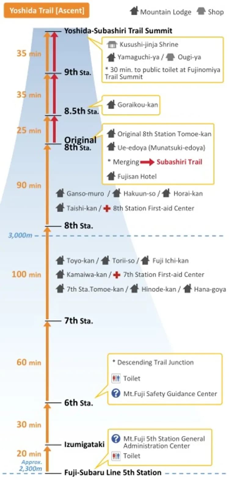 - 富士山五合目至山頂之間的洗手間需收費。請準備好足夠的零錢。即使在山間小屋住宿也需收費。每次約50-300日元。
