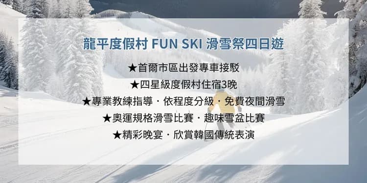 【首爾出發】韓國FUN SKI滑雪冬令營 - 龍平度假村四日遊|含6小時滑雪課、免費夜間滑雪 適合熱愛滑雪或是想體驗滑雪的旅客,也很受親子家庭的歡迎,帶小孩也能輕鬆享受雪地活動的樂趣!雪道等級等詳細內容請看行程頁之說明。