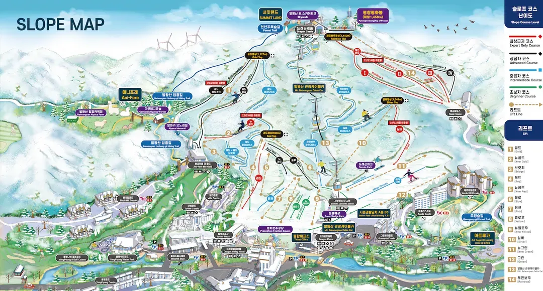 這裡設有彩虹滑雪道等 25 條不同水準的滑雪坡,還設有單程長達 3.7 公里的纜車路線等 14 條吊椅。除了可以進行阿爾卑斯式滑雪以外,還可以享受北方式滑雪、滑雪板、New School 滑雪等雪上項目。從 2002 年開始,還開設了各水準雪道匯集一處的「Dragon Park」,設有 halfpipe、quarter–pipe、Table Top、Spine、Wash Board、Mogul、Wave 等設施,深受滑雪愛好者的喜愛。