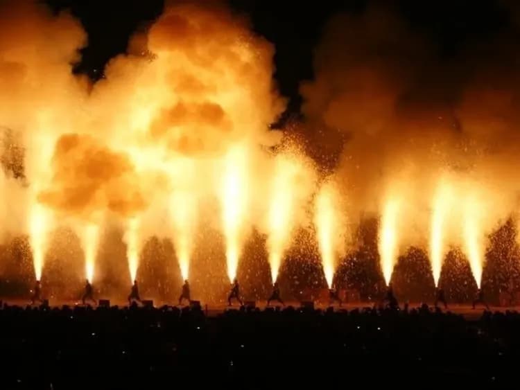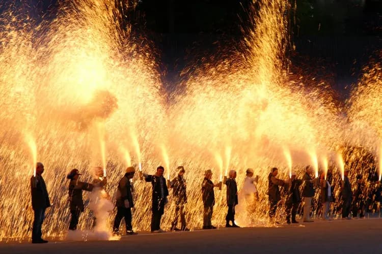 表演者雙手高舉手筒煙火,火焰與火花從圓筒中噴出,高達數公尺。