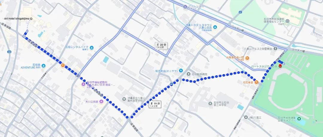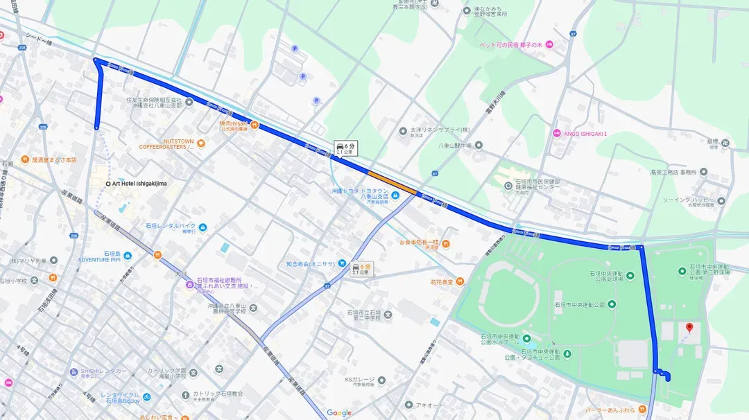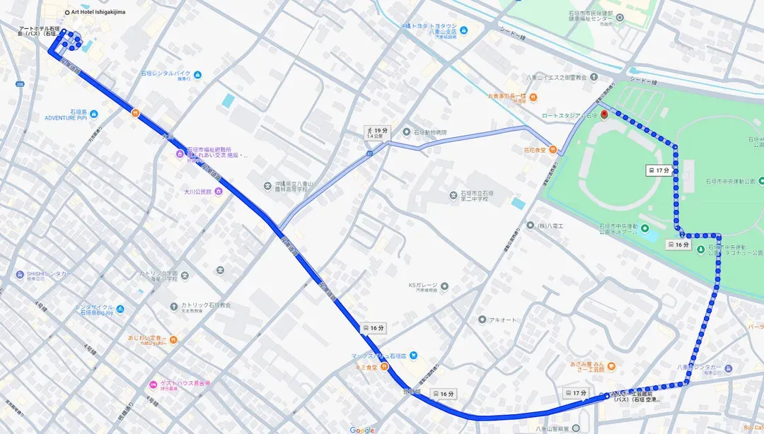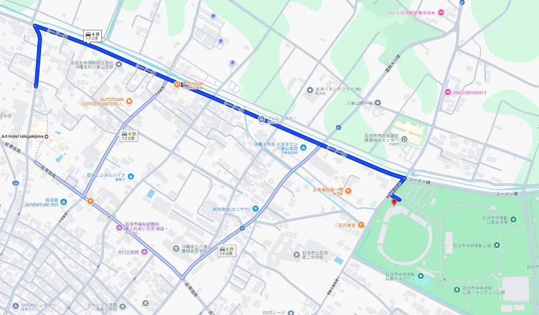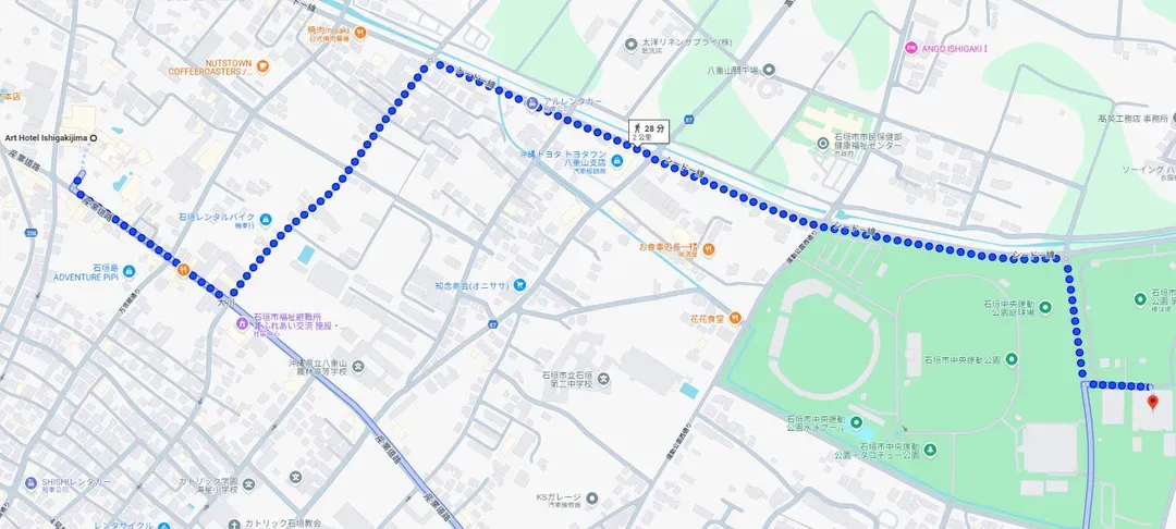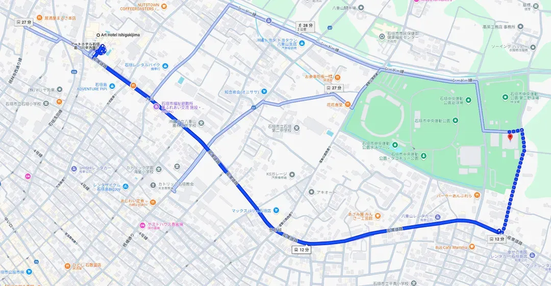 ■ 石垣島藝術飯店(Art Hotel Ishigakijima)↔️賽事會場(石垣市中央運動公園田徑場 (石垣市中央運動公園陸上競技場))
