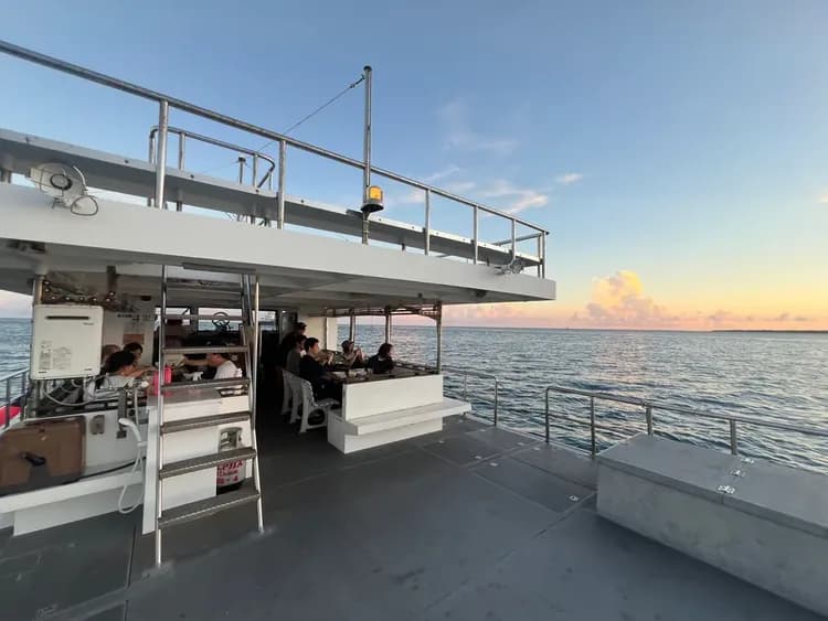 A:從港口出發後將航行約15分鐘至賞夕陽的地點,接著在海上停泊進行BBQ,之後再航行約15分鐘返回港口。
