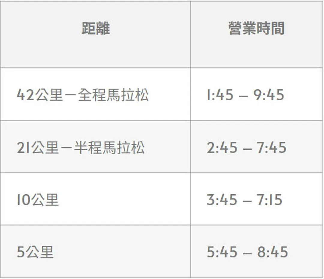 - 限制時間:〔全馬〕6小時30分〔半馬〕3小時30分〔10K〕2小時〔5K〕1小時30分