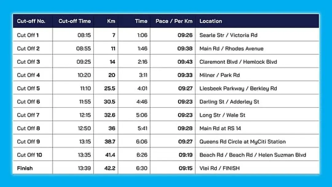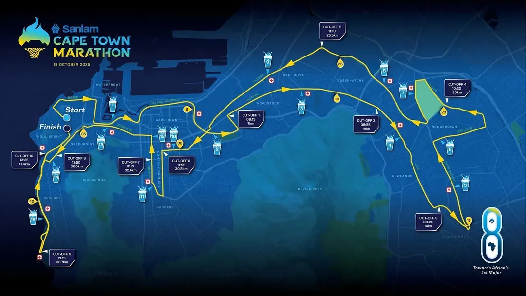 - 賽事起點:Fritz Sonnenberg Road, nearby Green Point Stadium 開普敦球場 (綠點球場)