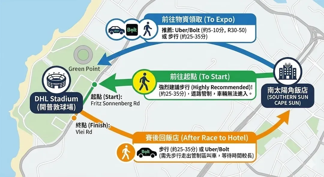 這是最穩妥、絕對不會受塞車影響的交通方式。南太陽角飯店距離賽事起點 Fritz Sonnenberg Road (DHL Stadium 旁) 僅約 2.5 公里。