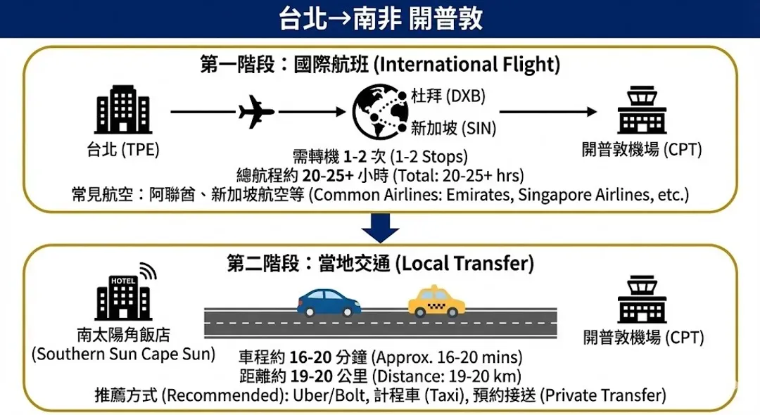 - 方式: 使用手機 APP 叫車 (Uber 或 Bolt 在開普敦都非常普及)。