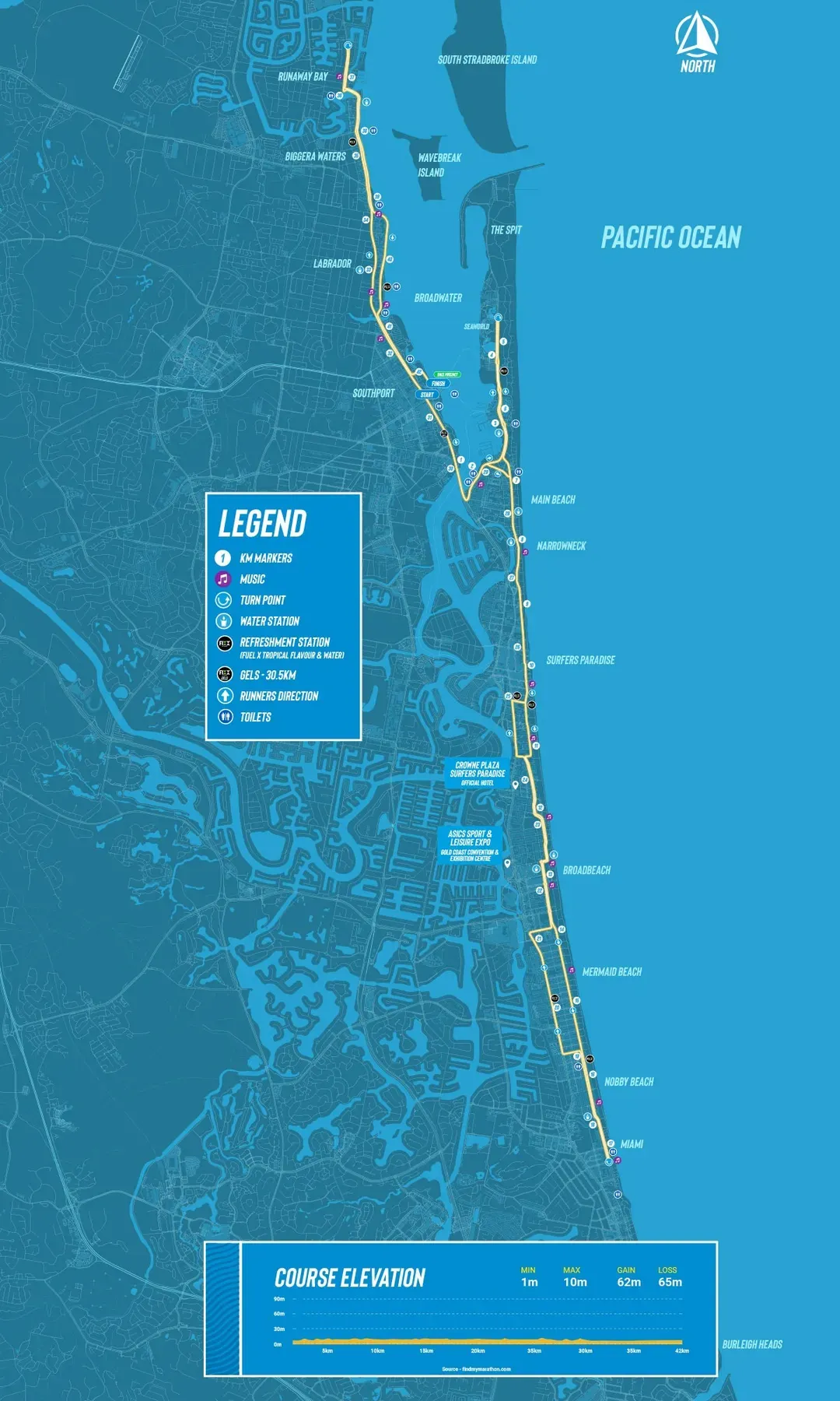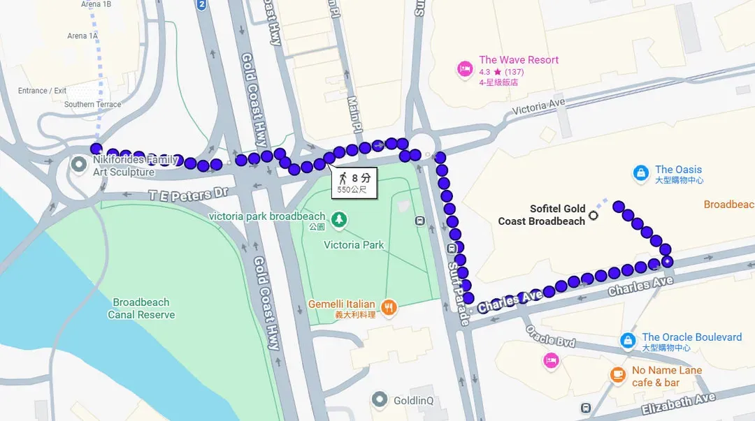 - 起/終點:Broadwater Parklands, Marine Parade, Southport. (起點位於 Nerang St,終點位於公園內)