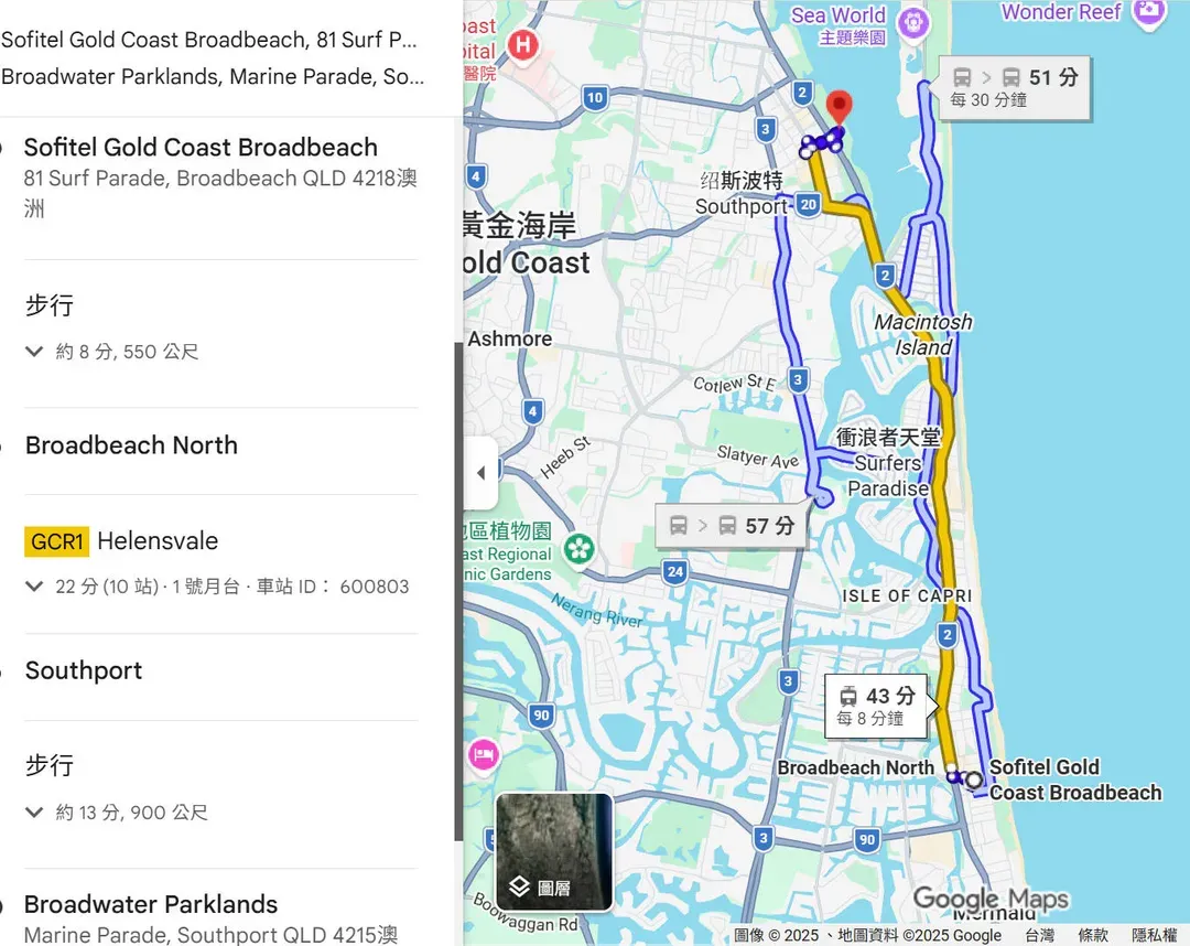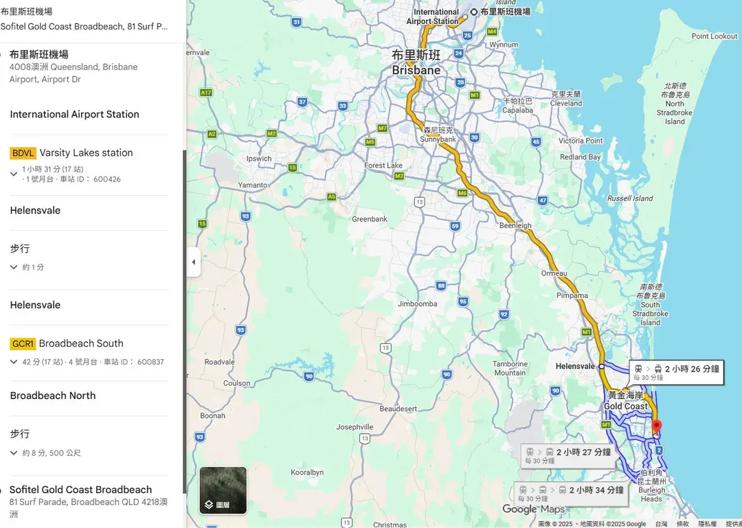 - 搭乘輕軌 G:link (往 Broadbeach South 方向),約 15 分鐘。