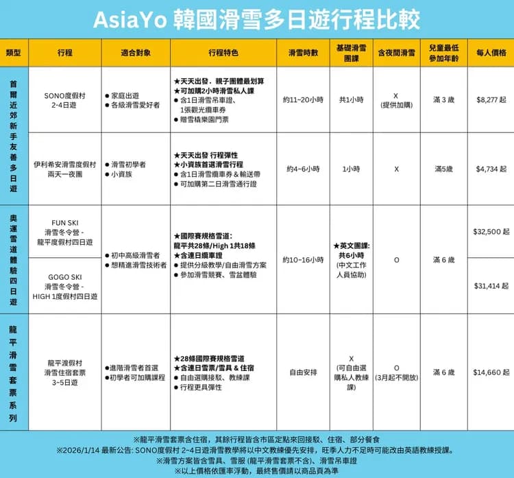 AsiaYo小總結:韓國勝在「便利與短天數」,日本則以「雪質與深度體驗」取勝!看更多「滑雪行程」。