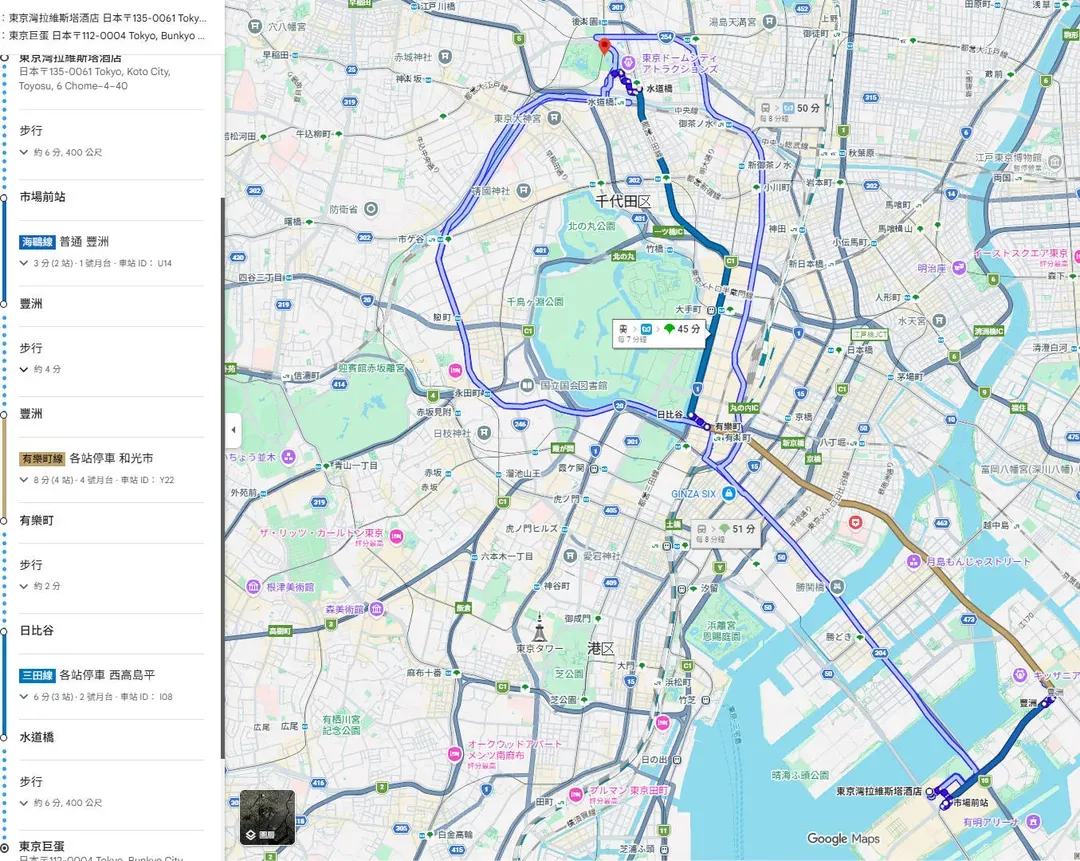 從飯店經空橋直達「市場前站」,搭乘百合海鷗號(往豐洲方向),至終點「豐洲站」,轉乘有樂町線至「有樂町站」下車,轉乘三田線至,在「水道橋站」下車,步行約5分鐘(500公尺)即可抵達東京巨蛋。