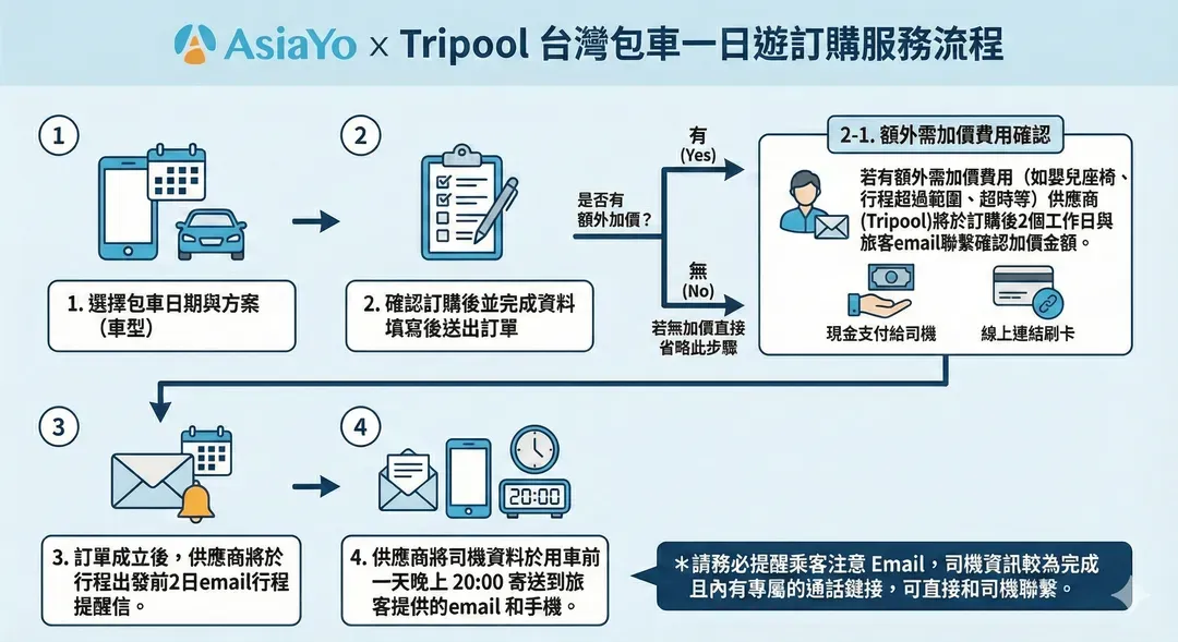 - 加價費用確認與支付: 供應商將於訂購後 2 個工作日內 透過 Email 與旅客聯繫,確認加價金額(例如:里程超過 300 公里、嬰兒座椅、超時費用等)。