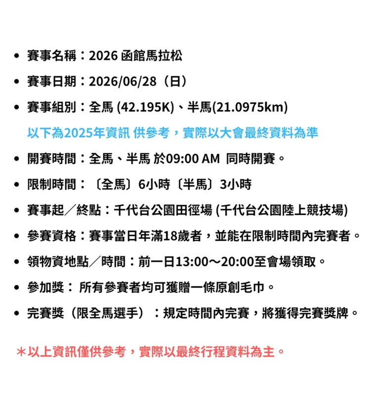 | 2026 函館馬拉松 | 全馬 (42.195K)、半馬(21.0975km) | 2026/06/28(日) | 全馬、半馬 於09:00 AM 同時開賽 | 參賽權+2晚住宿 |