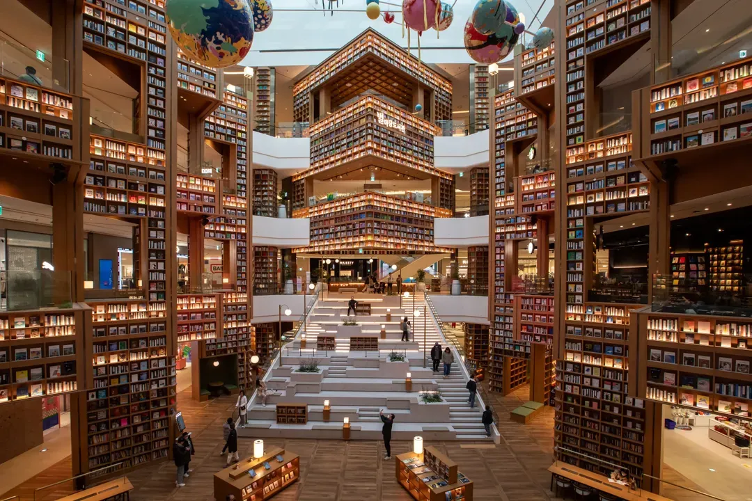 水原 Starfield 星空圖書館位於水原 Starfield 購物中心,以高聳書牆與璀璨懸吊球體著稱,提供免費閱讀與夢幻拍照空間,是熱門打卡景點。