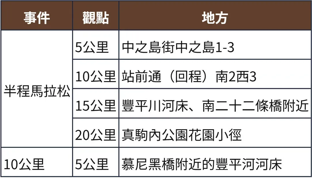 特別注意: 在半馬的 8.5km 附近(南大通)、9.5km 附近(北大通)及 11km 附近(札幌公園飯店前)這3處,為了行人穿越的應對措施,工作人員可能會指示跑者切換行進路線。 此外,若發生火災等緊急狀況,比賽可能會被迫中斷(屆時請遵從警察、消防人員及比賽工作人員的指示)。