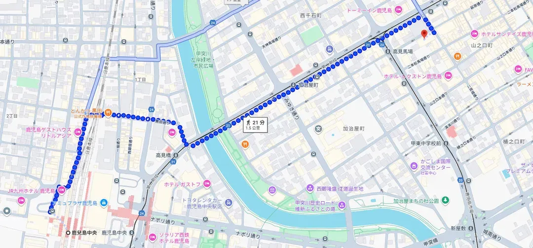 從終點步行18約分鐘(1.2公里),即可回到MYSTAYS 鹿兒島天文館飯店(HOTEL MYSTAYS Kagoshima Tenmonkan)。